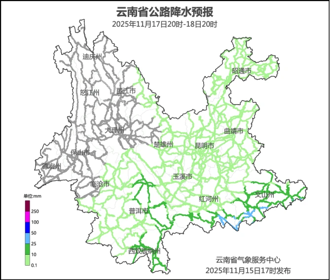 11月17日20时至11月18日20时受大雨影响的路段为: