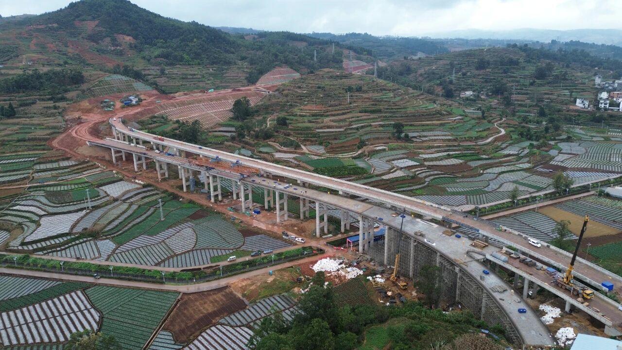 华宁南枢纽互通是项目控制性工程,互通桥梁全长872.1米,共包括9联现浇箱梁、173片预制梁和71根墩柱,桥梁最高处达28.5米。