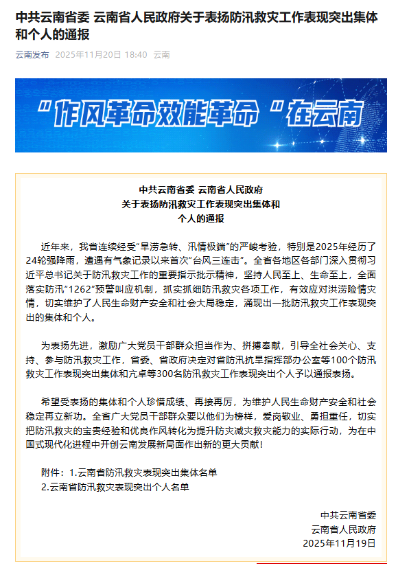 近日,中共云南省委、云南省人民政府通报表扬防汛救灾工作表现突出集体和个人,怒江公路局贡山公路分局光荣入选“云南省防汛救灾表现突出集体”名单。