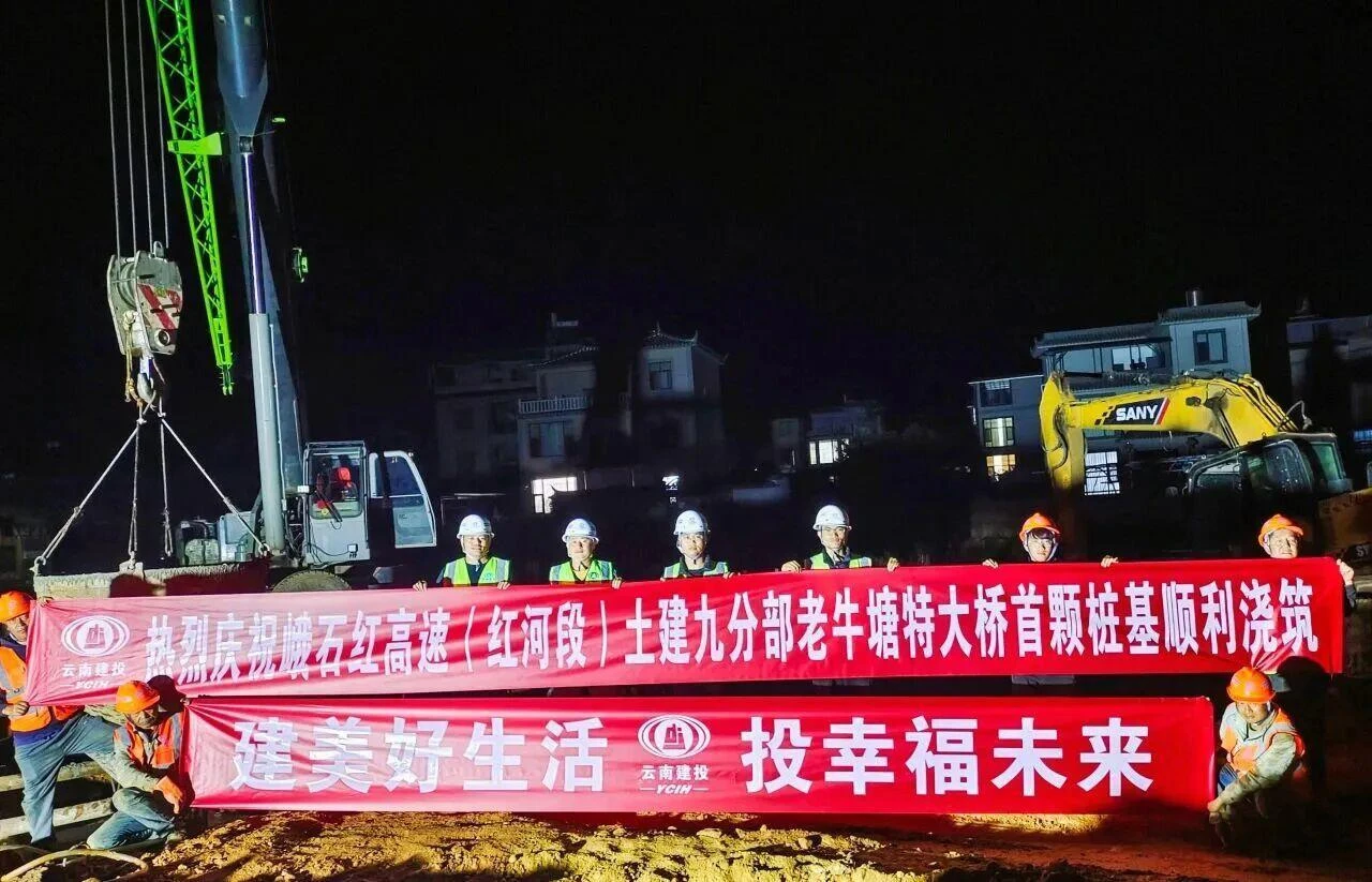 12月14日,峨石红高速公路(红河段)项目土建九分部首颗桩基在老牛塘特大桥左线(松村段)左幅9-2#桩浇筑完成。