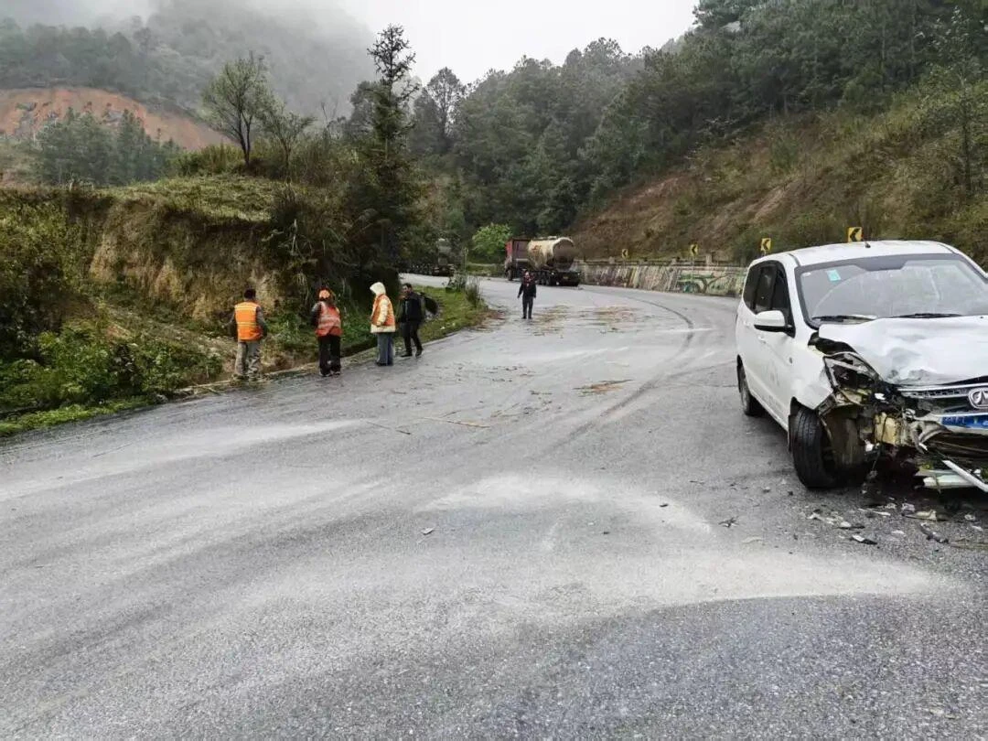 广南公路分局管养的国道323线K1737+000处2月19日发生一起交通事故,路面大量油污泄漏,由于雨天路滑、路段地处下坡弯道,车辆极易打滑失控,存在严重安全隐患。