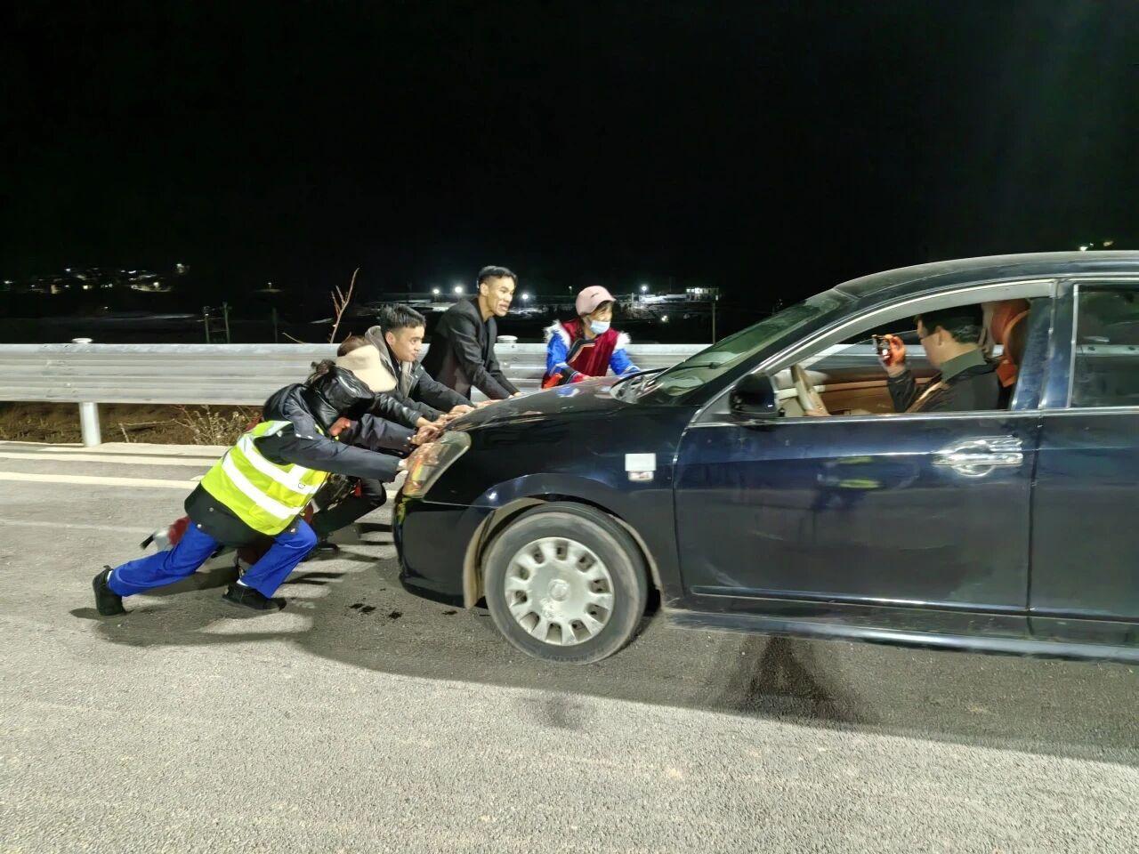 ▲云兰高速工作人员合力将故障车推至安全区域
