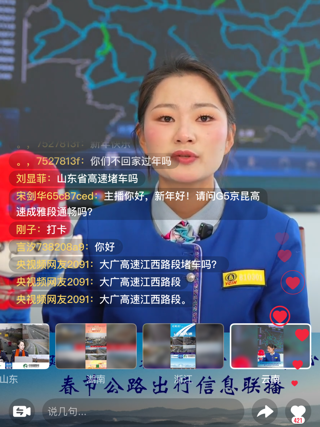 除了一线的暖心坚守,集团各高速项目还以精细化管理、智慧化防控为春运保畅加码,让安全保障更精准、更全面。运管中心参与交通运输部路网中心全国出行信息联播6次,在抖音及央视频双平台开展路况咨询直播12场,直播时长36小时,观看人次超10万人次。元蔓高速玉溪段监控中心化身高速路网的“智慧大脑”,工作人员24小时紧盯屏幕,实时监测车流变化、精准调度管控。