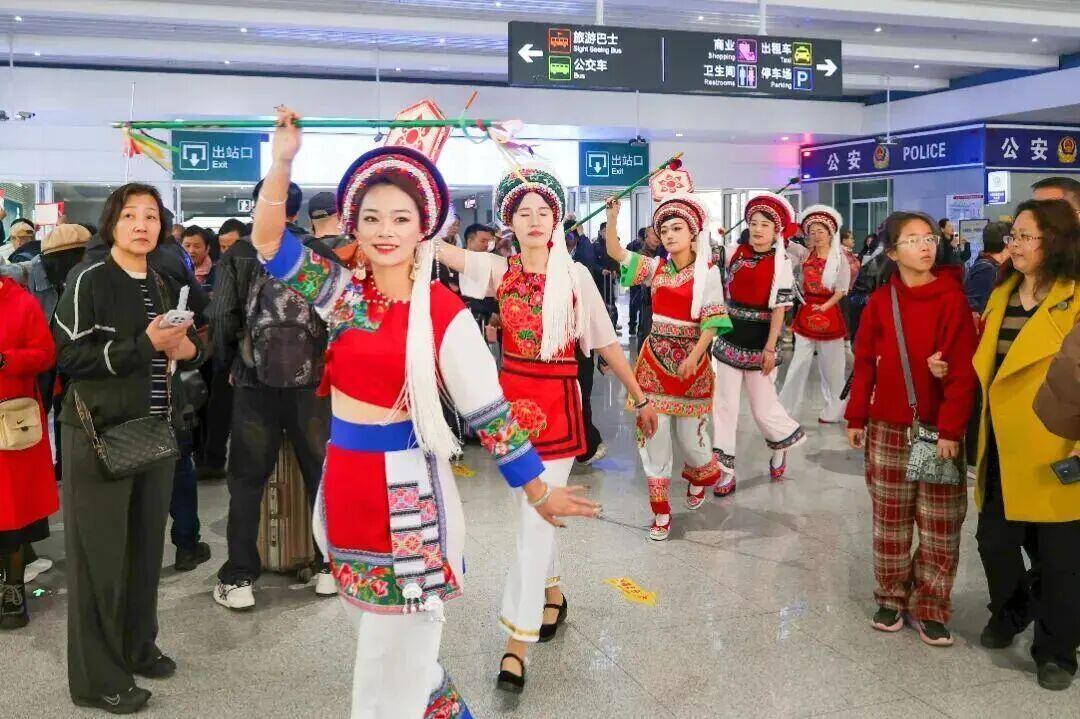云南省省级非物质文化遗产的霸王鞭与八角鼓舞,在新春的车站里精彩上演。