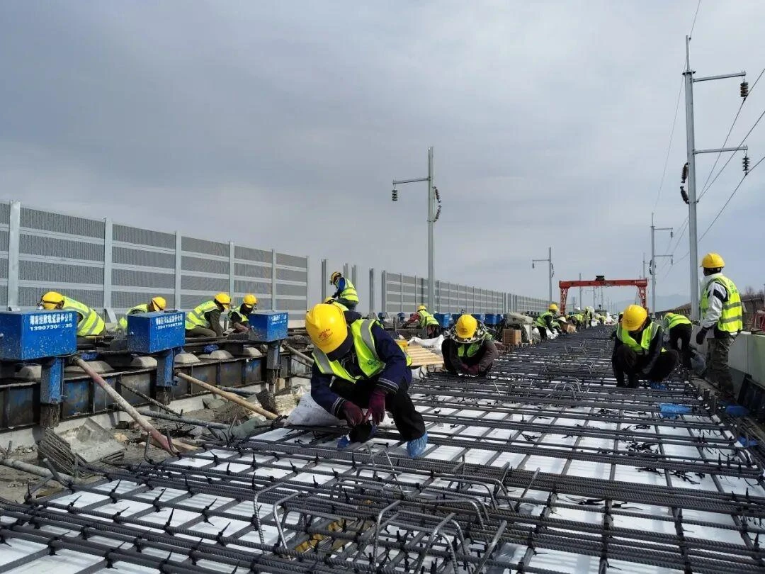 现场,钢筋绑扎、模板安装校正、混凝土浇筑等各道工序环环相扣,有条不紊。工人们神情专注,一丝不苟,确保每一块轨道板都达到最高质量标准。目前,仅在该分部管段内,每日就有超过500名建设者和60余台(套)大型机械设备同步投入施工,争分夺秒推进线下工程和轨道铺设工作。